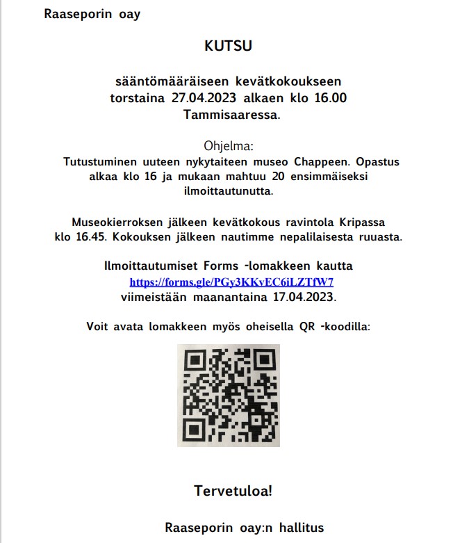 Yhdistyksen kevätkokous 27.4. klo 16.45 KirjoittanutMicaela11/04/2023Kategoria(t):Tulossa!Avainsanat:Huhtikuu, Kevätkokous, Kulttuuri Jos et käytä QR-koodia, ilmoittaudu täällä. Tutustu Chappeen täällä. Aiheeseen liittyy