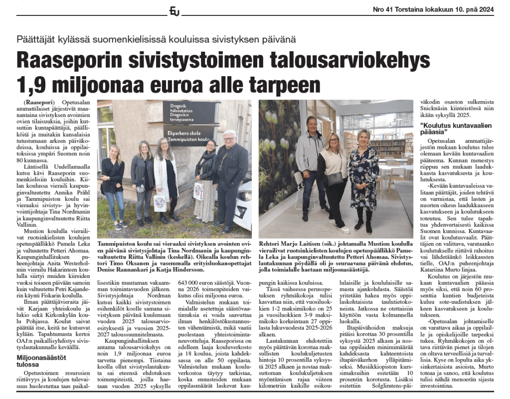 Paikallislehti Etelä-Uusimaa 10.10. uutisoi Sivistyksen avoimista ovista.