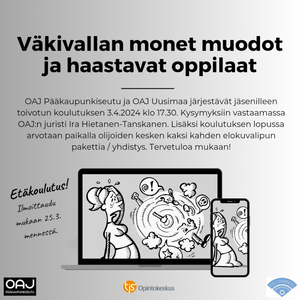 OAJ Pääkaupunkiseutu ja OAJ Uusimaa järjestävät yhteistyössä etäkoulutuksen ke 3.4.2024 aiheesta Väkivallan monet muodot ja haastavat oppilaat. Kouluttajana toimii OAJ:n juristi Ira Hietanen-Tanskanen.