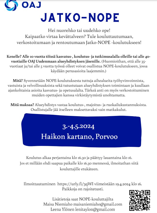 NOPE-koulutukset ovat suosittuja, joten jos alla oleva koulutus kiinnostaa, ilmoittaudu heti 3.4.2024 klo 12, kun linkki aukeaa: https://urly.fi/3qWI